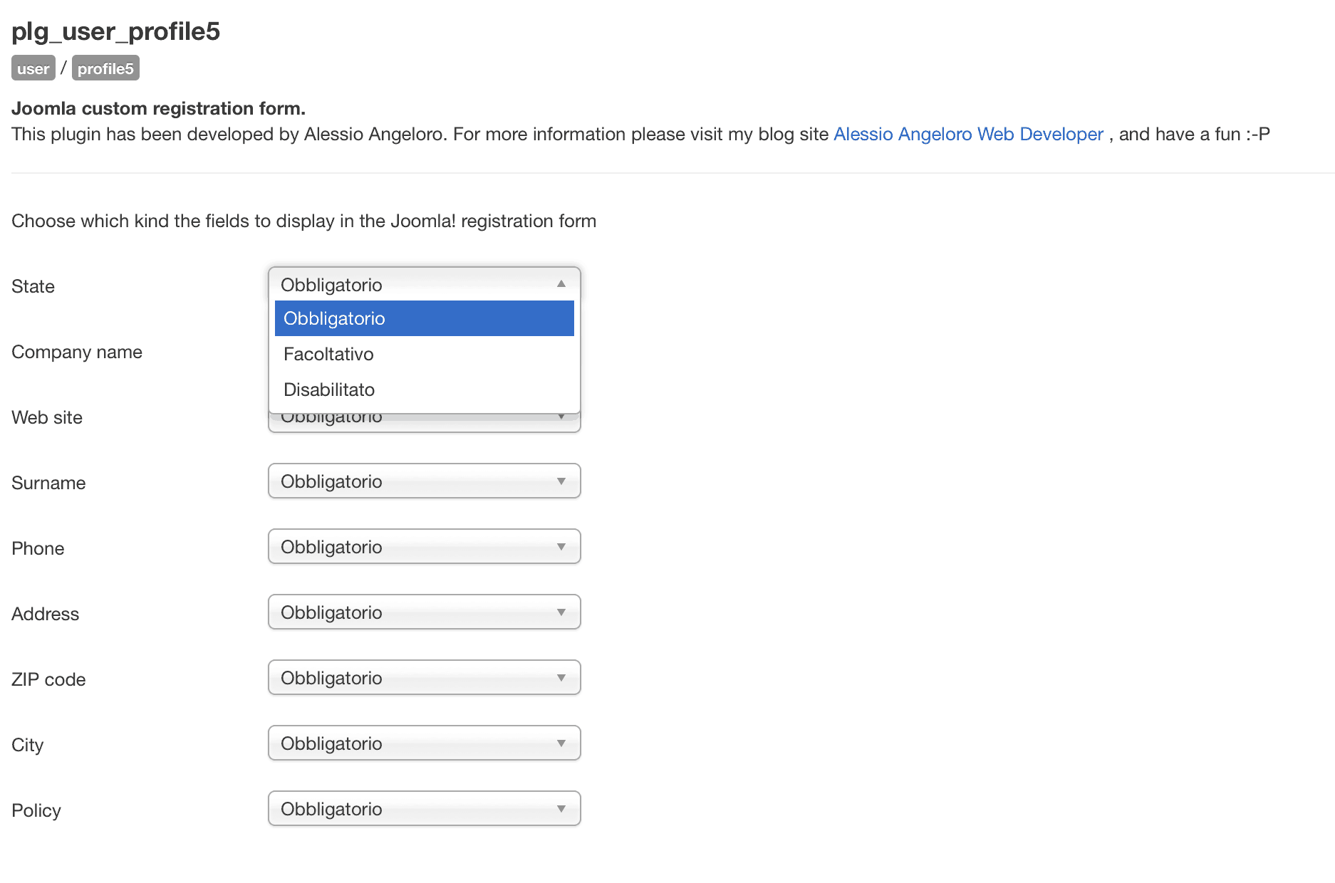 In buona sostanza oltre ad essere il file per l’installazione del plugin, ci permette anche di avere il controllo a backend su ogni campo (field) creato, infatti crea una select che permette di impostare ogni singolo campo su obbligatorio, facoltativo e disabilitato.