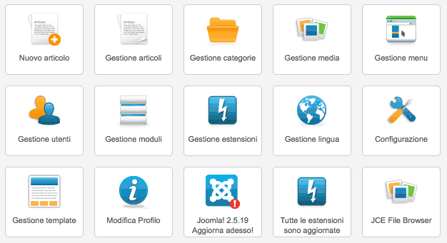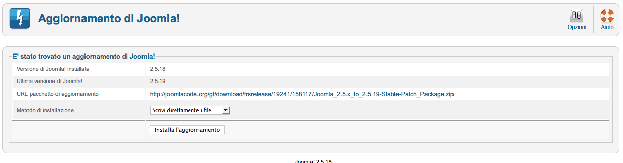 Effettuando l’accesso al backend di Joomla ci viene segnalato che è presente un aggiornamento tipo “ Joomla! 2.5.19 Aggiorna adesso!”
