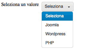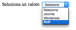<label>Seleziona un valore</label> <select name="service"> <option value="seleziona" selected>Seleziona</option> <option value="Joomla">Joomla</option> <option value="Wordpress">Wordpress</option> <option value="PHP">PHP</option> </select> |