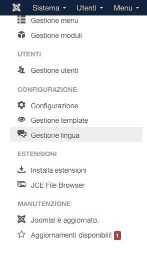 Il metodo più rapido e sicuro è quello di recarsi nell’area manutenzione di Joomla, si arraggiunge facilmente accedendo al pannello di controllo e cliccando sul logo di Joomla in alto a sinistra (vedi figura), poi cliccando su “Aggiornamenti disponibili” o “Tutte le estensioni sono aggiornate” (la voce cambia a seconda che abbiate o meno aggiornamenti da fare).