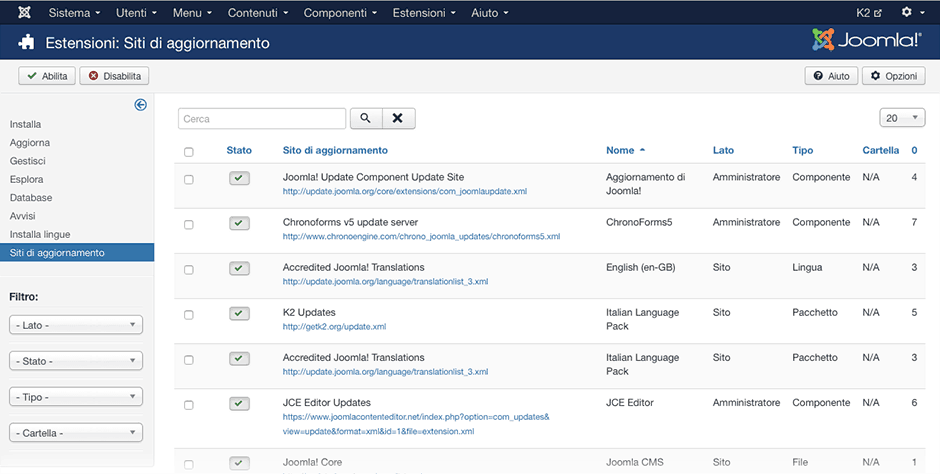 Successivamente cliccare su “Siti di aggiornamento” per avere una lista di tutte le estensioni che sono predisposte per ricevere gli aggiornamenti, ecco un esempio