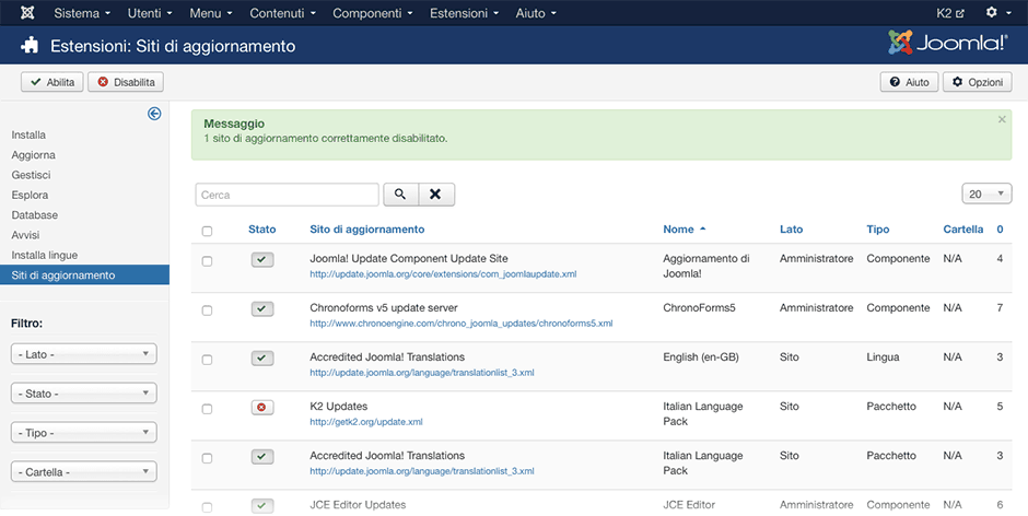 Sono comunque del parere che esistono dei casi in cui si può valutare di disattivare la richiesta di aggiornamento di un modulo, un plugin o un componente installato in Joomla; vuoi perchè un’estensioni è stata modificata, vuoi perchè il componente è a pagamento ed è scaduta l’iscrizione, ecc, ecc…