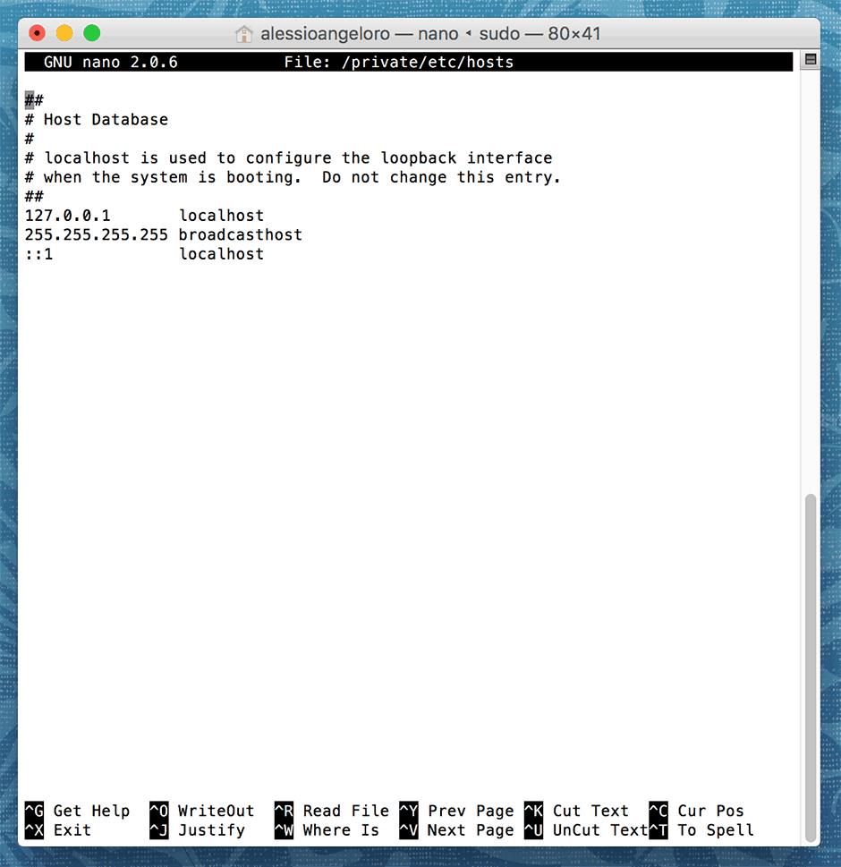 Ora all’interno del terminale useremo l’editor visual “nano” per editare il file hosts, quindi digitiamo quanto segue e premiamo invio : sudo nano /private/etc/hosts , digitate la vostra password e premete invio, subito si aprirà il file hosts con i relativi record, lascio quello di default