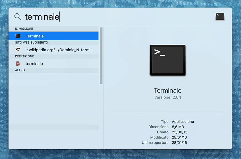 Il file host si trova nella directory in private/etc , per aprilo possiamo ricorrere al terminale di MacOs, quindi premiamo cmd + barra spaziatrice per aprire la ricerca Spotlight ed al suo interno digitiamo “terminale” e successivamente premiamo invio per aprire il terminale .