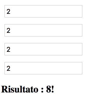 <!DOCTYPE html> <html xmlns:ng="http://angularjs.org" id="ng-app" ng-app> <script src="http://ajax.googleapis.com/ajax/libs/angularjs/1.4.8/angular.min.js"></script> <body> <div ng-app> <input ng-model="primo" placeholder="Primo numero!" type="text" /></br> <input ng-model="secondo" placeholder="Secondo numero!" type="text" /></br> <input ng-model="terzo" placeholder="Terzo numero!" type="text" /></br> <input ng-model="quarto" placeholder="Quarto numero!" type="text" /></br> <h1> Risultato : {{primo--secondo--terzo--quarto}}! </h1> </div> </body> </html> |