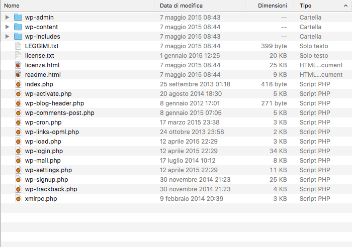 Una volta scaricato il file lo possiamo scompattare, al suo interno troveramo il file wp-config-sample.php e wp-config.php (molto difficile che ci sia), questi due file vanno eliminati