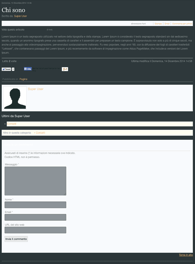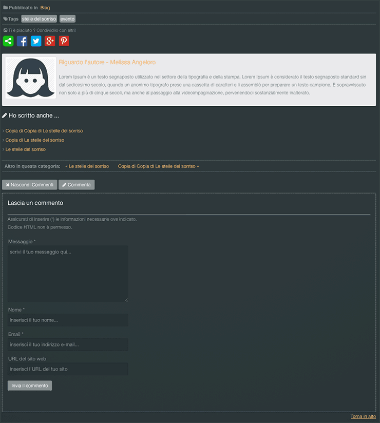 Nella terza e quarta immagine ho inserito due pulsanti che richiamano una funzione in jQuery, non fa altro che mostrare e nascondere un div, in questo caso l’ho utilizzata per mostrare o nascondere i commenti ed il relativo form di inserimento.