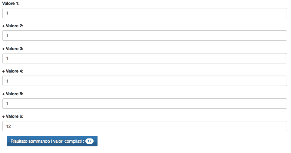 <div class="container"> <form role="form"> <div class="form-group"> <label>Valore 1: </label> <input class="form-control" type="text" id="v1" onKeyUp=" calcola(); " /> </div> <div class="form-group"> <label>+ Valore 2: </label> <input class="form-control" type="text" id="v2" onKeyUp=" calcola(); " /> </div> <div class="form-group"> <label>+ Valore 3: </label> <input class="form-control" type="text" id="v3" onKeyUp=" calcola(); " /> </div> <div class="form-group"> <label>+ Valore 4: </label> <input class="form-control" type="text" id="v4" onKeyUp=" calcola(); " /> </div> <div class="form-group"> <label>+ Valore 5: </label> <input class="form-control" type="text" id="v5" onKeyUp=" calcola(); " /> </div> <div class="form-group"> <label>+ Valore 6: </label> <input class="form-control" type="text" id="v6" onKeyUp=" calcola(); " /> </div> </form> <!--stampa i risultati a video--> <div class="container" id="risultato"></div> </div> |