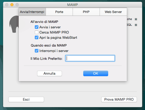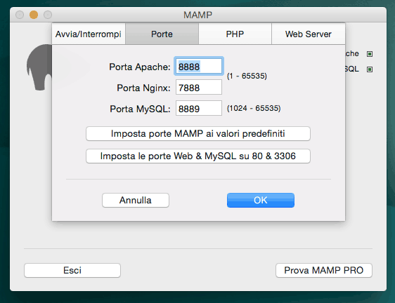Nelle preferenze di MAMP è possibile modificare le impostazioni predefinite e all’occorrenza rispristinare i valori di default cliccando su “Imposta porte MAMP ai valori predefiniti”