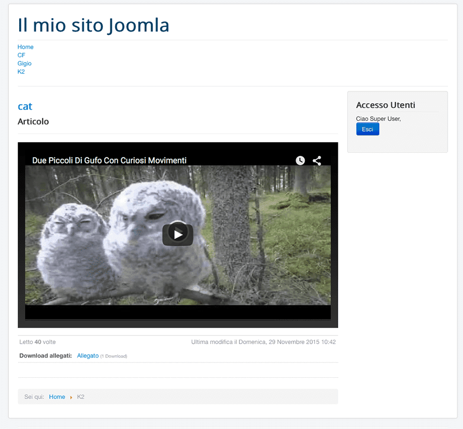 Ho utilizzato K2 perchè il sistema nativo di Joomla! non supporta (almeno per ora, chissà in futuro) la categorizzazione a 3 livelli, infatti gestisce fino al secondo livello; oltre a questo mi è stato richiesto di mostrare i video e gli allegati solo agli utenti che hanno fatto accesso al sito, perchè il cliente vuole raccogliere i dati per poi utilizzarli per l’invio di informazioni commerciali.