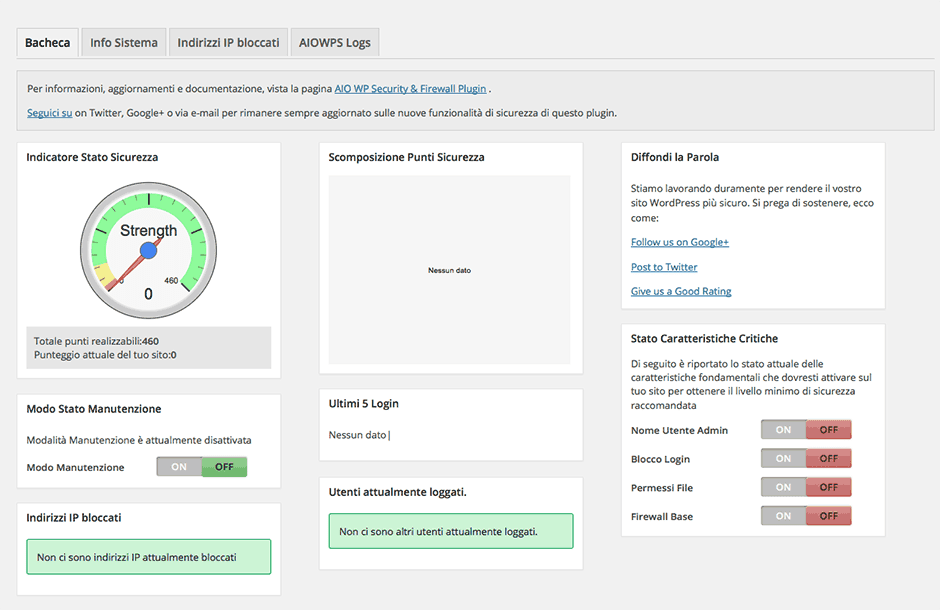 Cliccando su “Sicurezza WP” si accede alla bacheca del plugin