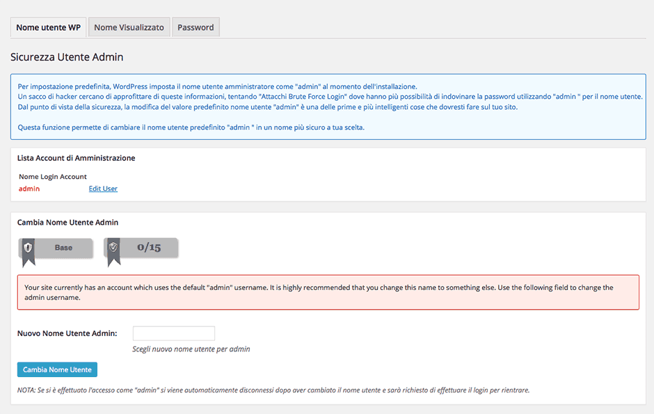 Digitare un nome utente diverso da admin e premere il pulsante “Cambia Nome Utente”, nell’immediato si verrà disconnessi dal back end, riconettersi utilizzando il nuovo utente.