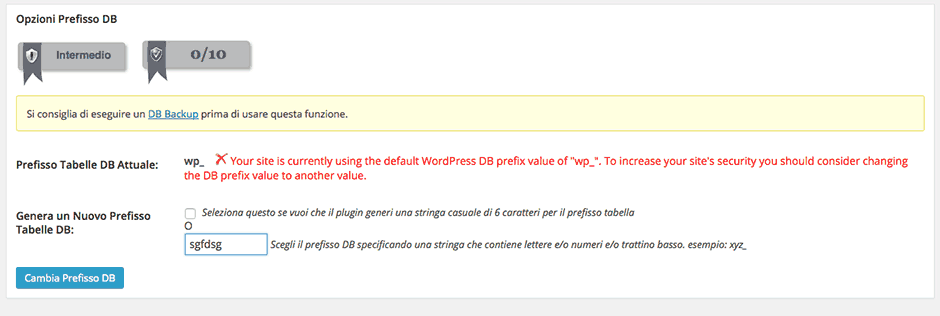 Successivamente potete utilizzar un prefisso per le tabelle diverso da wp_, è sufficiente specificarlo nella casella e premere “Cambia Prefisso DB”