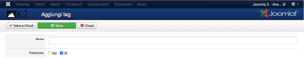 Da qui è possibile inserire manualmente dei tag che potranno successivamente essere utilizzati per taggare i vari articoli, è sufficiente cliccare “Nuovo” per aggiungerne uno e poi “Salva e Chiudi” per salvarlo.