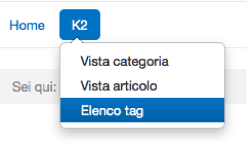 Dalla gestione menu di Joomla! creare una nuova voce e come tipo voce di menu scegliere K2 e poi ”Tag – Crea una voce di menu con un link a un tag di K2”