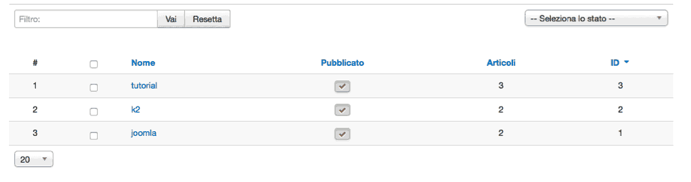 Cliccando su Componenti\K2\Tags si aprirà un elenco di tutti i tag utilizzati sul sito.