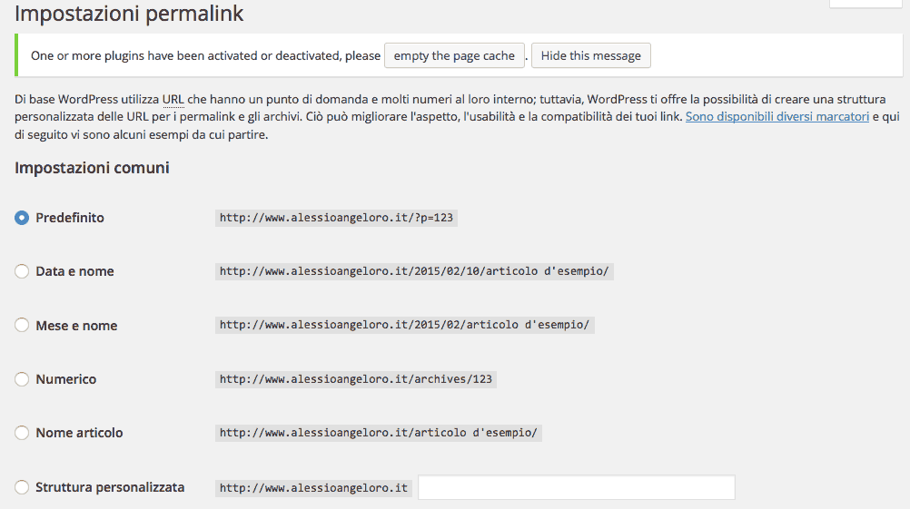 Quando trasferite un sito WordPress su un dominio diverso, consiglio vivamente di disabilitare i permalink, questo perché a trasferimento avvenuto, le pagine e gli articoli potrebbero non essere raggiungibili, sempre per lo stesso motivo delle immagini, WordPress utilizza i link assoluti.