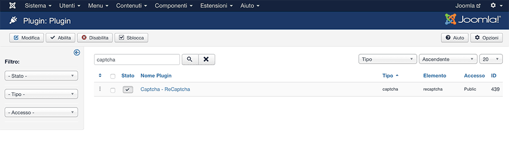 In Joomla è presente il plugin reCaptcha che permette di utilizzare il servizio di Google reCaptcha , di default il plugin è disabilitato e per avere l’opzione “Captcha – ReCaptcha” nella configurazione globale di Joomla è necessario abilitarlo a mano da Estensioni \ Plugin e nel search digitare “captcha” e premere invio, successivamente abilitare il plugin.