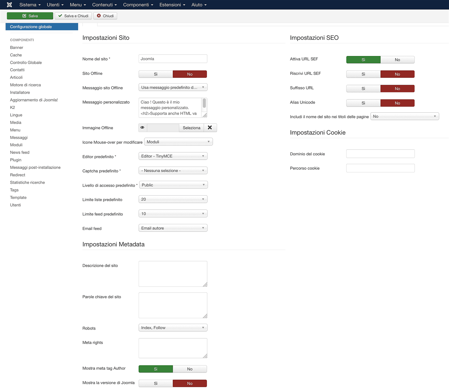 I parametri in questo file sono frutto delle modifche al pannello di configurazione globale di Joomla, ossia questo