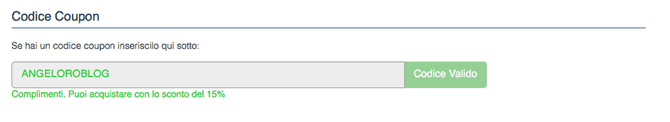 Lo sconto lo potete applicare dopo che avete inserito il prodotto nel carrello, in fase di registrazione troverete una sezione con scritto “Codice Coupon”, inserite il codice che vi lascio sotto e cliccate su “Convalida Codice”.