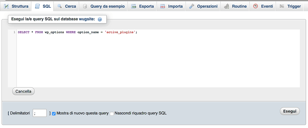 Eliminare la cartella dall’ftp non aiuta, è quindi necessario ricorrere ad agire direttamente sul db, quindi colleghiamo in PHPMyAdmin e accediamo al database incriminato, cliccando su “SQL” potremo inserire la query che lascio qui sotto e premere esegui.